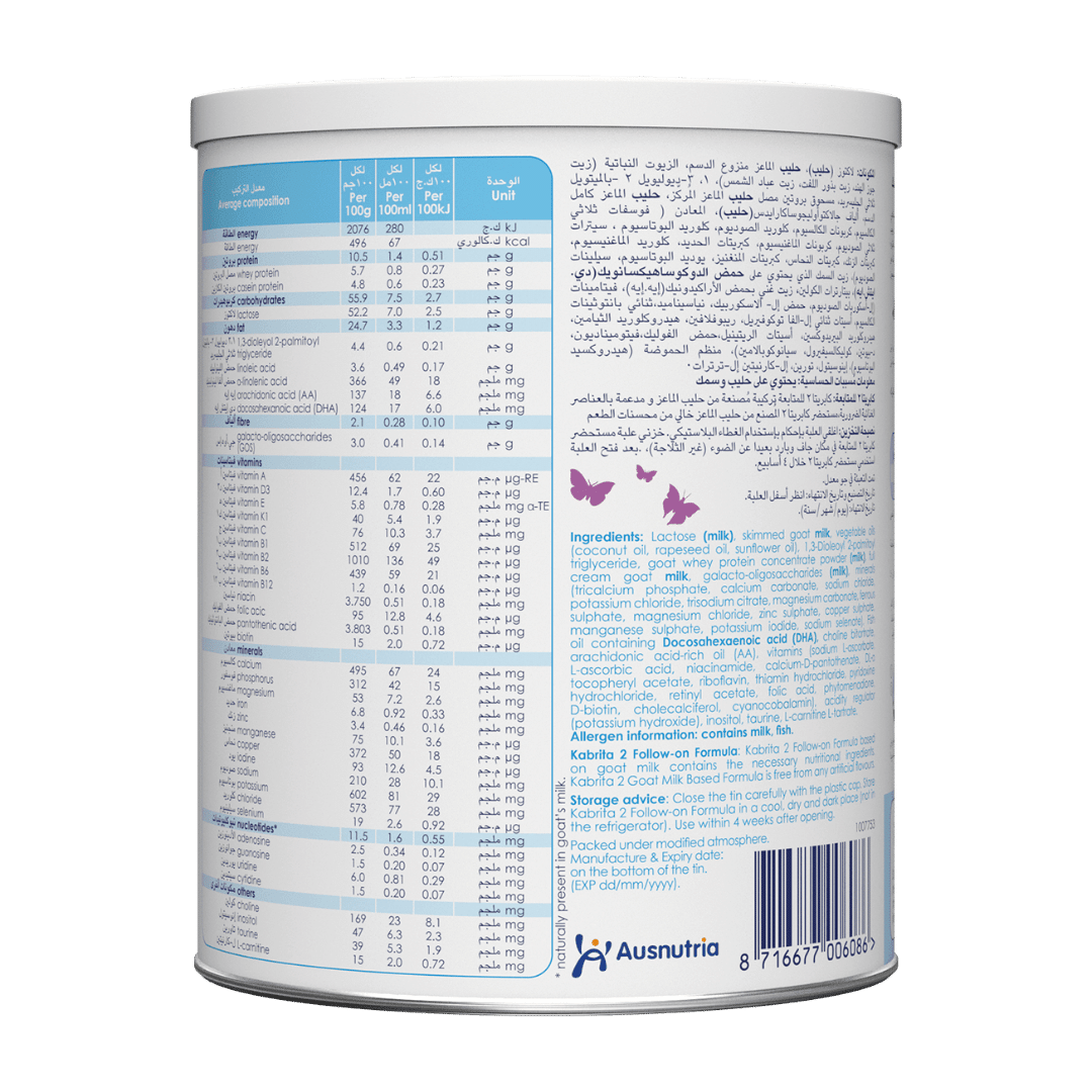 تم تطوير كابريتا المرحلة 2 لدعم احتياجات طفلك الغذائية من عمر 6 إلى 12 شهرًا. يحتوي على حليب الماعز الهولندي الطبيعي الغني ببروتين A2 المعروف بلطافته وسهولة هضمه، مما يجعله خيارًا مثاليًا أثناء فترة التغيير الغذائي. بفضل مزيجه المتوازن من الفيتامينات والمعادن، وطعمه الخفيف، يمنح كابريتا طفلك تغذية مغذية تحبها الأمهات وتقبلها الصغار.
