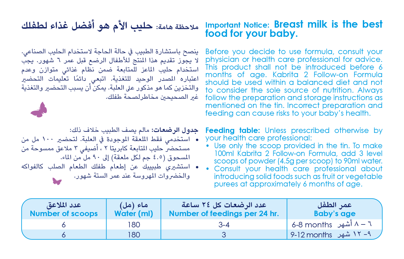 الرضاعة الطبيعية هي أفضل مصدرٍ لتغذية طفلكِ. أما إذا كنتِ لا ترضعين طفلكِ رضاعةً طبيعية أو كنتِ ترغبين في إرضاع طفلك حليباً صناعياً، فإن حليب كابريتا تركيبة الرضع (0-6 أشهر) هو الخيار الأمثل لذلك. حليب الرُّضَّع كابريتا مناسبٌ لحديثي الولادة، ولكن قبل أن تقرري استخدام حليب، عليكِ استشارة متخصص الرعاية الصحية.