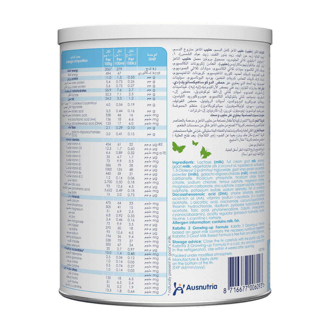 صُممت تركيبة كابريتا المرحلة 3 خصيصًا للأطفال من عمر 12 شهرًا فما فوق، لتزويدهم بالعناصر الغذائية الأساسية التي تدعم النمو والطاقة وتطور الدماغ. تحتوي على حليب الماعز الهولندي الطبيعي سهل الهضم، والغني ببروتين A2 والفيتامينات والمعادن اللازمة للمرحلة القادمة من تطور طفلك. بفضل مذاقه الخفيف وتركيبته النقية، يُعتبر كابريتا خيارًا موثوقًا ضمن النظام الغذائي الصحي للطفل.